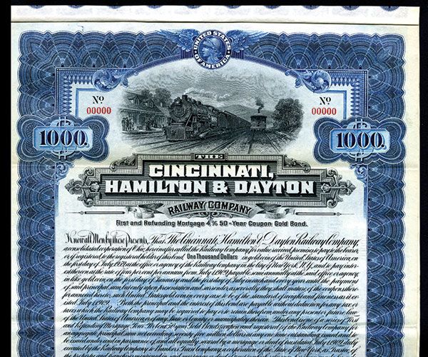 Ohio. 1909. $1000 4% Specimen Bond. Black print with blue border and underprint. Locomotive approaching station and one leaving station top center. POC's and red SPECIMEN overprints. VF condition. ABNC. Listed railroad but unlisted bond in Cox.