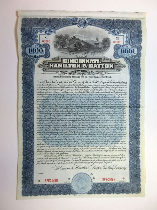 Ohio. $1,000 Specimen 4% First and Refunding Mortgage Gold Coupon Bond, Black print on blue border and under tint, Locomotive approaching station at top with another leaving, Specimen overprints and POC's, VF-XF condition, ABNC.