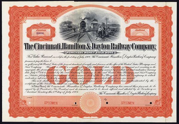 Ohio, 1904, Horizontal $-odd Purchase Money Gold Note specimen bond, orange border with locomotive passing track workers, specimen overprints, POCs, ABNC, XF.