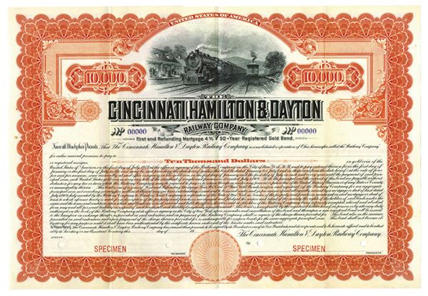 Ohio. $10,000 Specimen 4% 1st and Refunding Mortgage Registered Gold Bond, Black print on large orange/red border and under tint, Image of locomotives at top, Specimen overprints and POC's, VF-XF condition, ABNC.