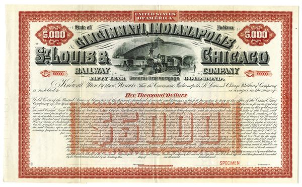 Indiana. $5,000 Specimen 4% Registered General 1st Mortgage Bond, Black print on red/brown border and under tint, Locomotive leaving station at top under company title, Specimen overprints and POC's, VF-XF condition, FBNC.
