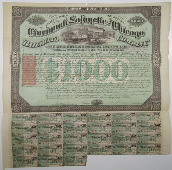 IN & IL. $1000 I/U 7% First Mortgage Coupon Bond #175, Black text with black border and green background, Train passing by waiting passengers at top center. Imprinted Revenue RN-W2, Fine condition and repaired with Archival reinforcement at splitting along fold lines, still n attractive bod. Henry Seibert & Bros.