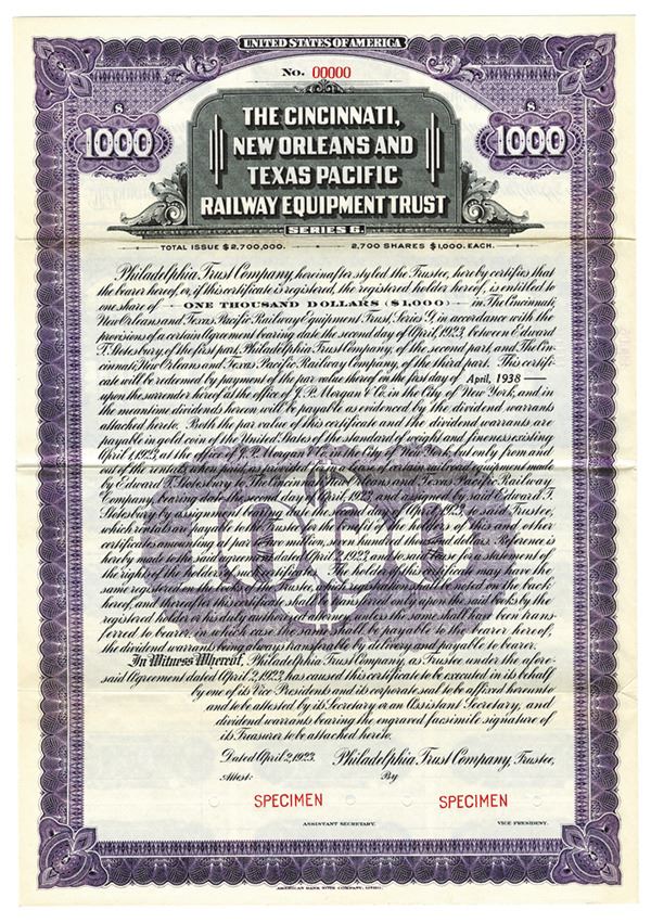 Ohio. $1000 Specimen 5% Series G Coupon Bond, Black print on purple border and under tint, Company title at top, Specimen overprints and POC's, VF-XF condition, ABNC. Unlisted earlier date and design.