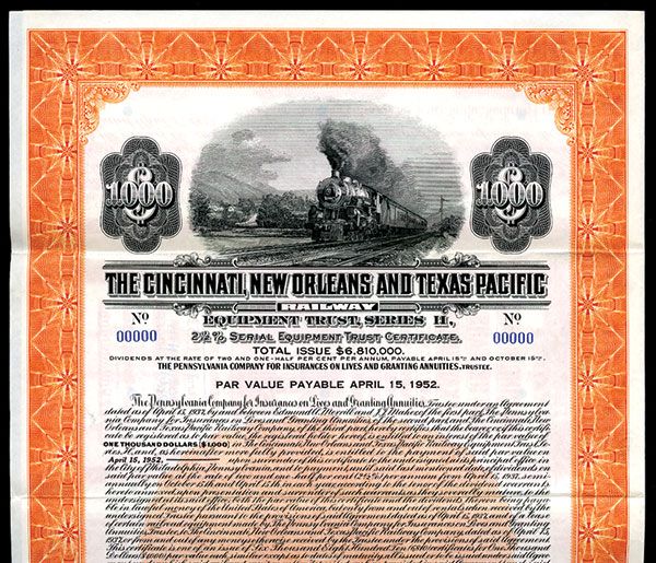 1937. $1000 Specimen Bond. Black print with orange border and underprint. Moving locomotive top center. POC's and red SPECIMEN overprints. VF condition. ABNC.