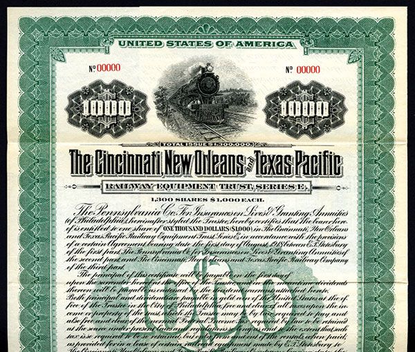 1918. $1000 Specimen Bond. Black print with green border and underprint. Moving locomotive top center. POC's and res SPECIMEN overprints. VF condition. ABNC.