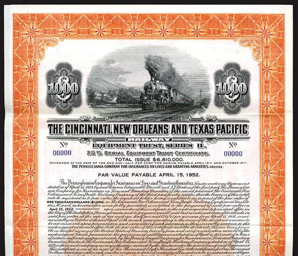 1937. $1000 Specimen 2 1/2% Serial Equipment Trust Certificate Bond. Black print with orange border and under print. Vignette of moving locomotive top center. POC's and red SPECIMEN overprints. VF condition. ABNC.