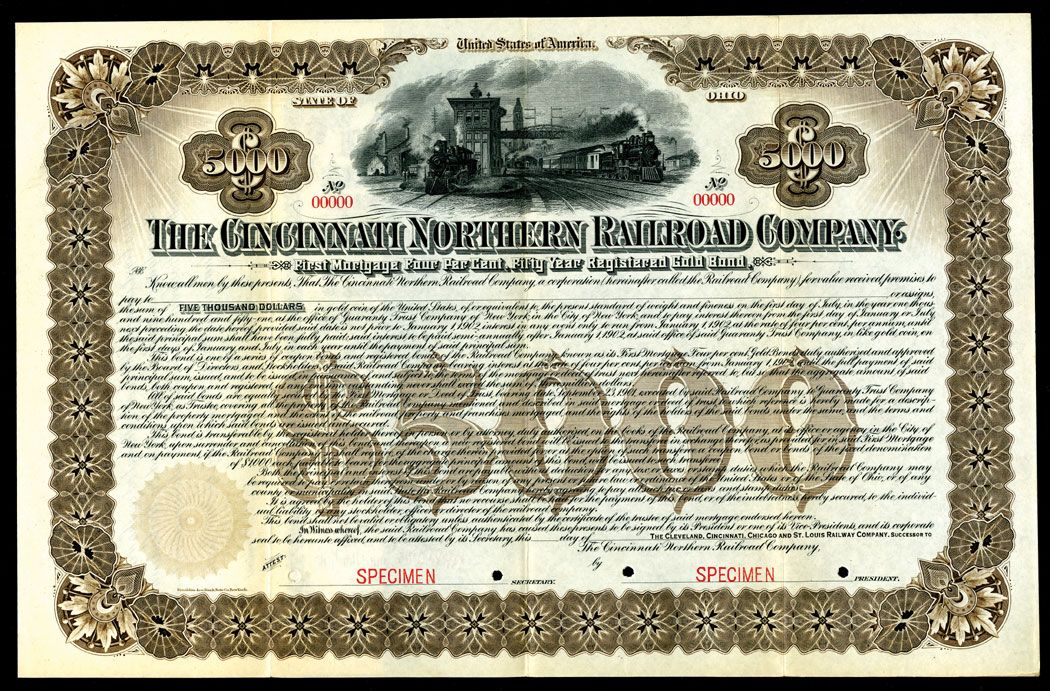 Ohio, 1906, $5000 1st Mortgage 4% Registered Gold Bond Specimen, Brown border and underprint, locomotive passing signal tower on right with a second train at left, Listed railroad, unlisted bond in Cox, only listed as stocks. 1 of 3 found in the archives and the only one available. ABNC.