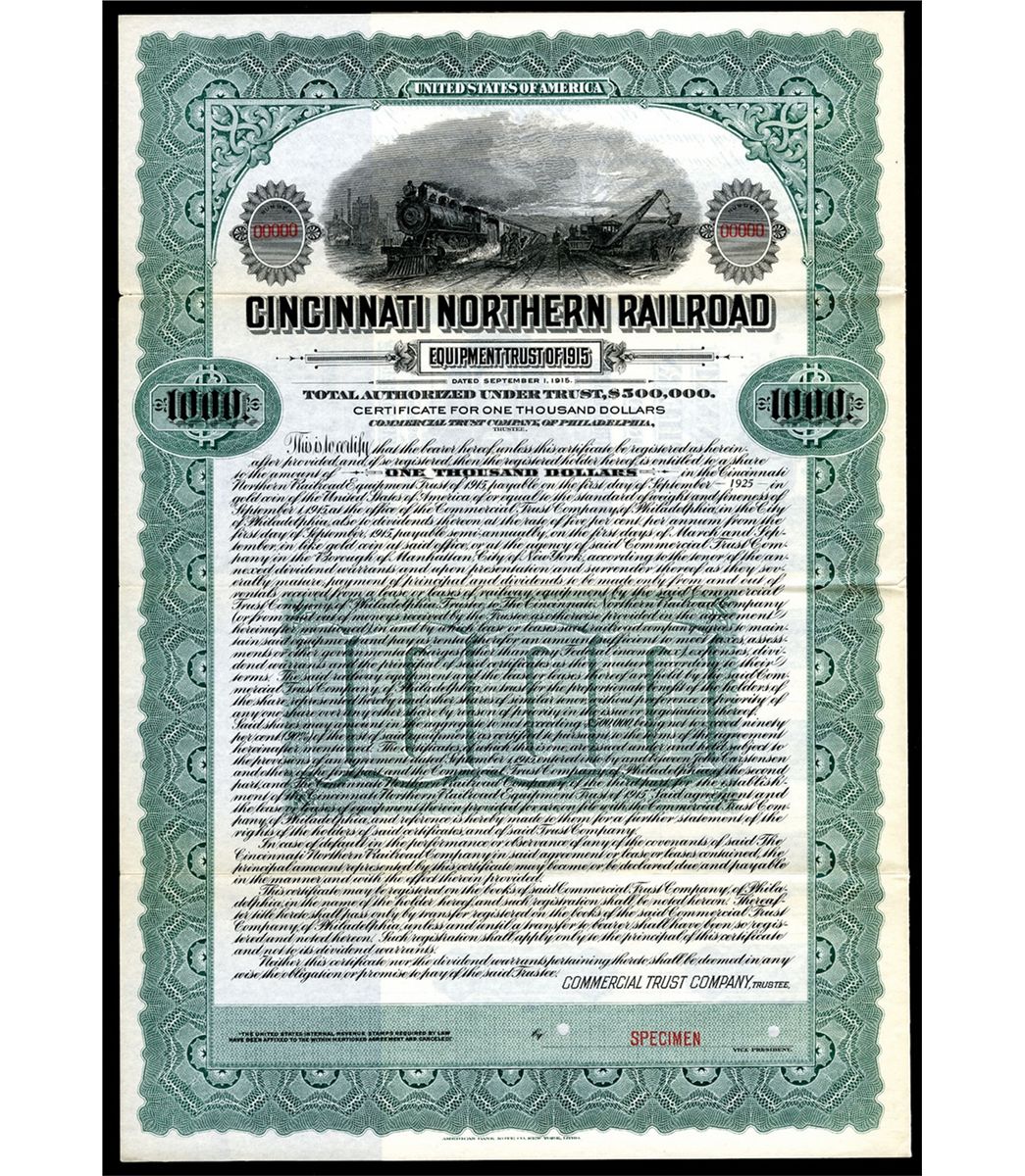 Ohio, $1000 5% Coupon Bond Specimen, Green border and underprint, locomotive passing workers and crane, Listed railroad, unlisted bond in Cox, only listed as stocks. 1 of 2 found in the archives and the only one available. ABNC.