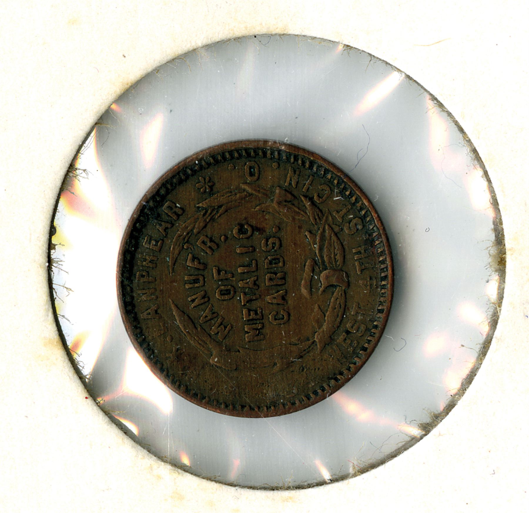 1861-65 (Undated). William K. Lanphear Civil War Store Card, OH-165-CY-97, Obverse with LANPHEAR, MANUF'R OF METALLIC CARDS surrounding by wreath, Reverse with faded product offerings. Dies by the Lanphear shop. Fine condition. Rarity 2.