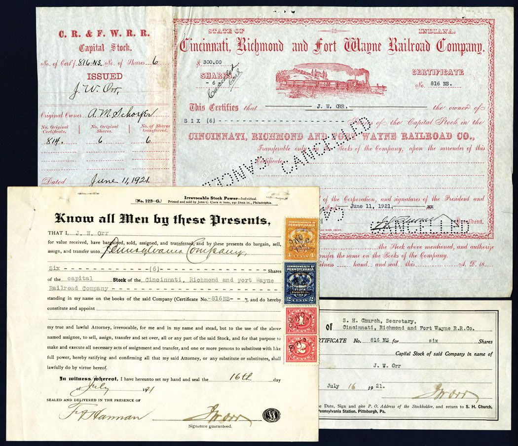 Richmond, Indiana, 6 Shares, I/C, Red printing, locomotive L-R. VF.