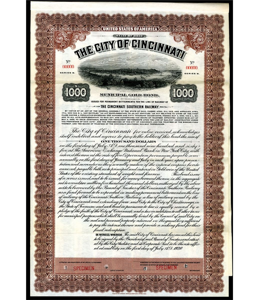 Cincinnati, Ohio. 1920. $1000, 5%, Series B, Specimen Gold Coupon Bond, "For Permanent Betterments for the Line of Railway of the Cincinnati Southern Railway". Brown border and underprint. Birds-eye-view of Cincinnati. POC's. XF condition. ABNC. Unlisted railroad and bond variety in Cox.
