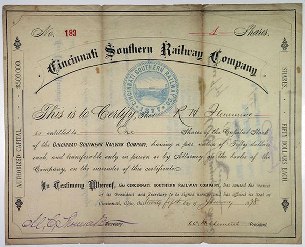 Ohio. 1 Share I/U Capital Stock Certificate, #183, Black text with thin black border, underprint of company crest in light blue. Fine condition with some toning along vertical fold lines. Unlisted as a stock certificate in Cox, Very Rare.