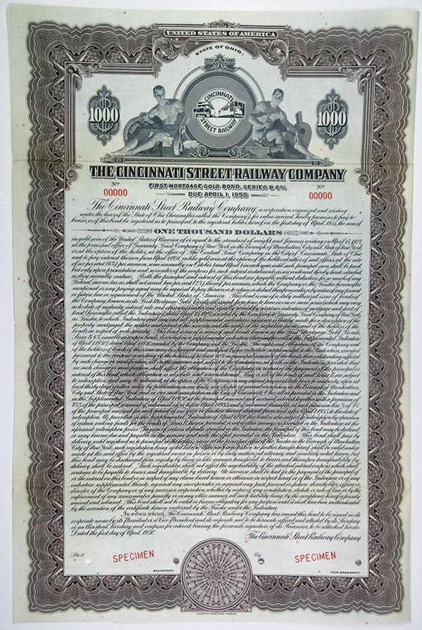 Ohio. $1000 Specimen 6% First Mortgage Gold Bond, Series B, Black text with brown border and undertint, seated males flank logo. Red specimen overprints, "00000" serial numbers, and POC's, VF condition. Listed as Rare in Cox.