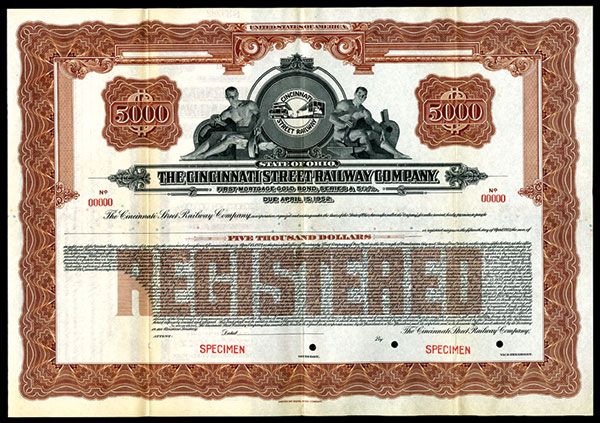 Ohio. 1927. $5000 5 1/2% Specimen Bond. Black print with brown border and underprint. Company logo flanked by allegorical males top center. POC's and red SPECIMEN overprints. VF-XF condition. ABNC. Listed railroad and bond but in lower denomination.
