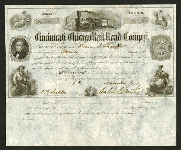 Cincinnati, Ohio, November 6th, 1855, 20 Shares, I/U, Black on thin off white paper, Allegorical figures in corners, locomotive R-L, S/N 518, VF condition with a small ink burn hole in the name of the stock owner top middle right, RWH&E, Cincinnati. Rare and early Ohio railroad. Only one other stock is reported in Cox, Signed by Caleb Blood Smith as President. Smith was an Indiana politician; a State representative (1833-1837 and 1840-1841); a U.S. Representative (1843-1849). Smith was rewarded for helping secure Lincoln's nomination in 1860 with position of Secretary of the Interior (1861-1862); he was also a U.S. District Court judge 1863-1864 before joining the railroad.