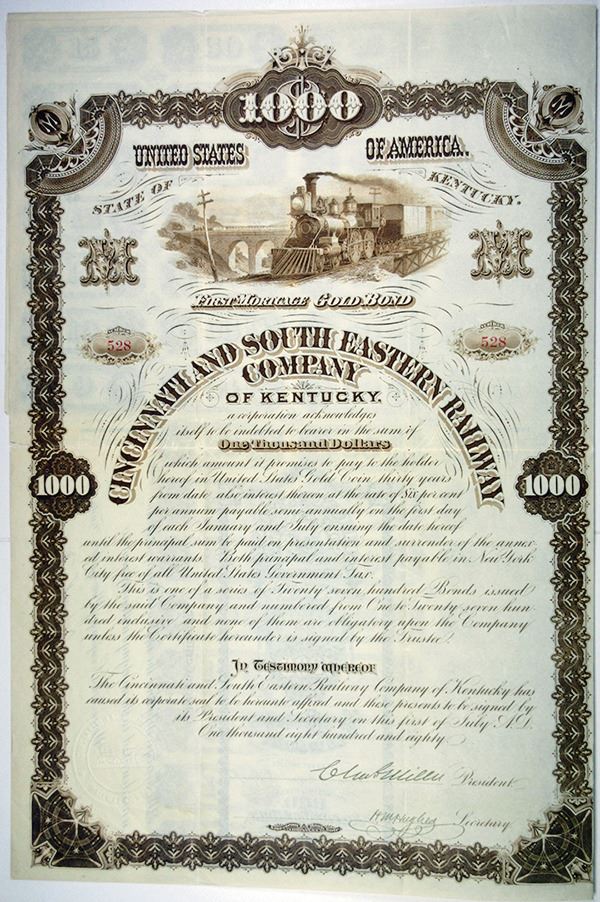 Kentucky. $1,000 Issued 6% First Mortgage Gold Coupon Bond, Brown print on brown border, Locomotive crossing over bridge at top, VF-XF condition with minor splitting at fold line, ABNC.