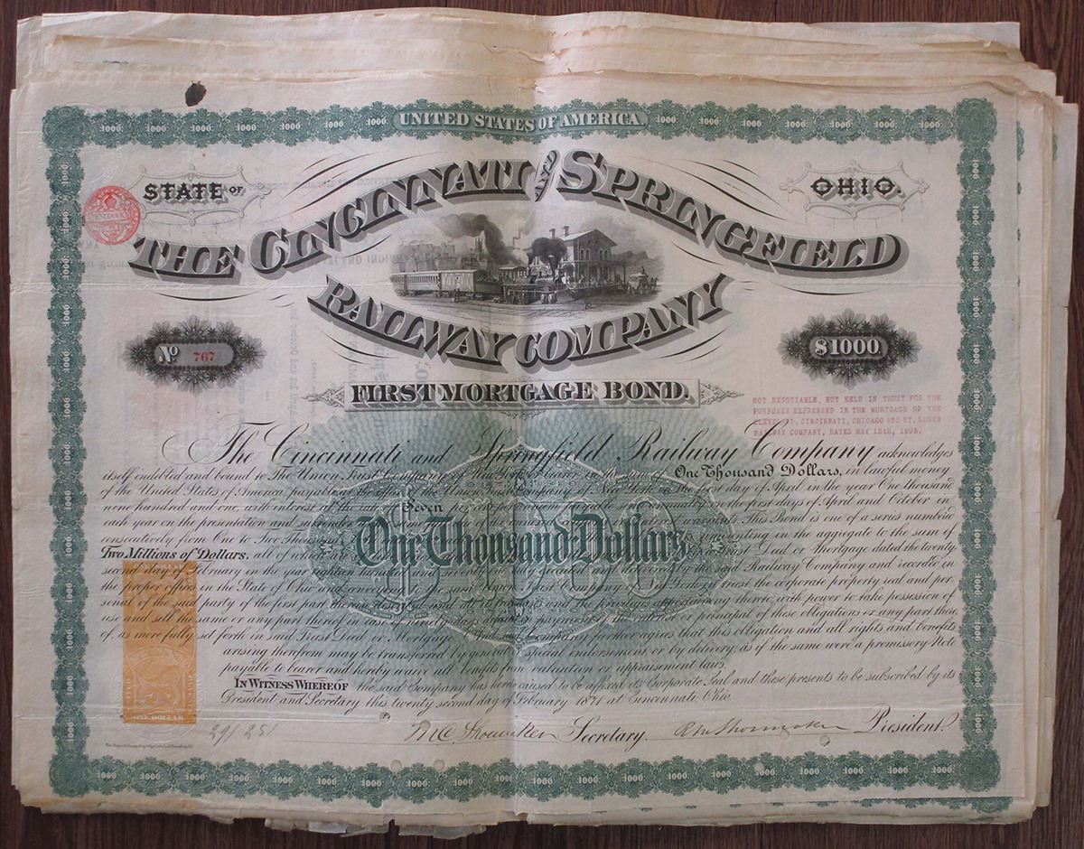 Ohio, 1871. Group of 25 bonds, all: $1000 I/C 7% First Mortgage Bonds, Black text with green border and undertint, Train arriving at station at top center. Orange imprinted revenue stamp at left, POCs. Fine condition. Several bonds are signed by Augustus Schell as Vice President on back. Augustus Schell (August 1, 1812 Ð March 27, 1884) was a New York politician and lawyer. He was Chairman of the Democratic National Committee from 1872 to 1876. (25)