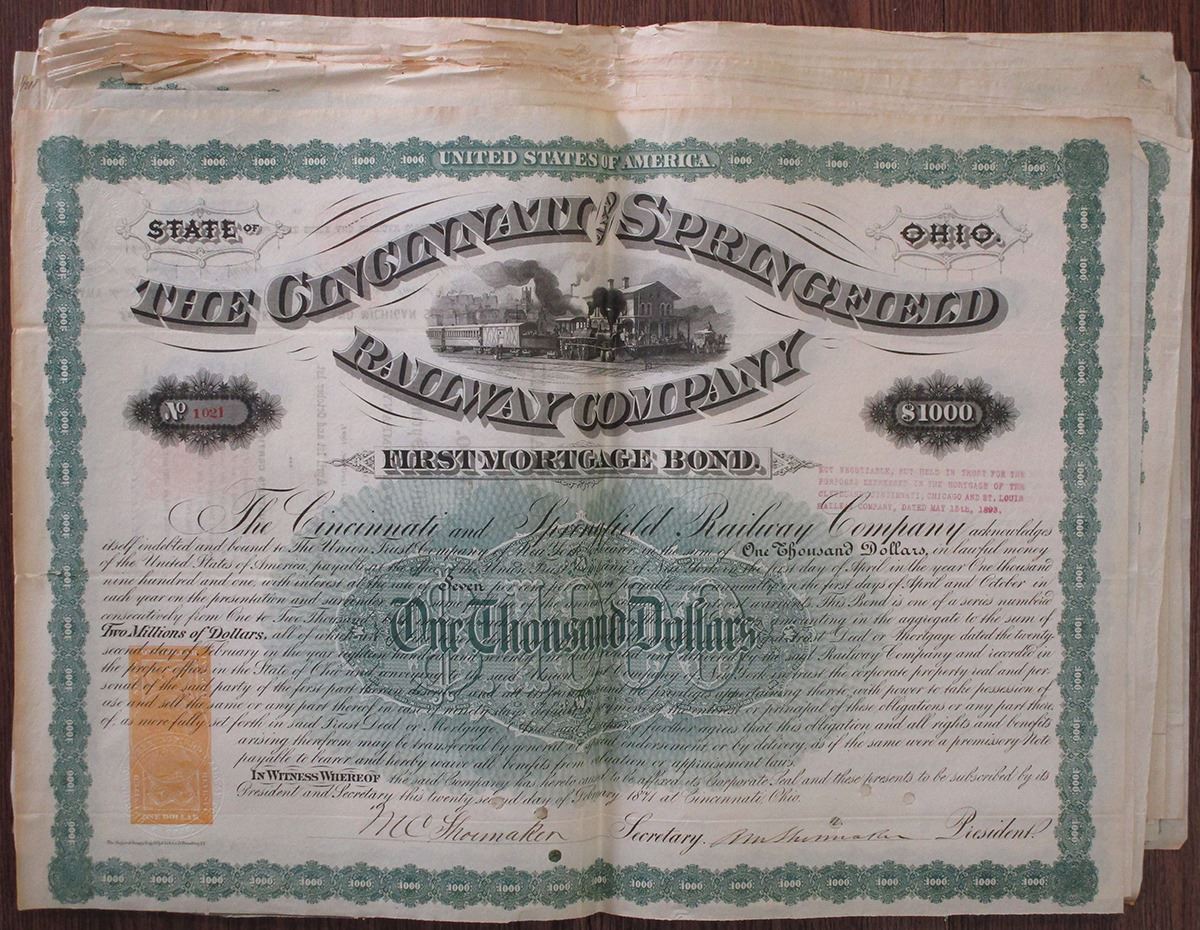 Ohio, 1871. Group of 25 bonds, all: $1000 I/C 7% First Mortgage Bonds, Black text with green border and undertint, Train arriving at station at top center. Orange imprinted revenue stamp at left, POCs. Fine condition. Several bonds are signed by Augustus Schell as Vice President on back. Augustus Schell (August 1, 1812 Ð March 27, 1884) was a New York politician and lawyer. He was Chairman of the Democratic National Committee from 1872 to 1876. (25)