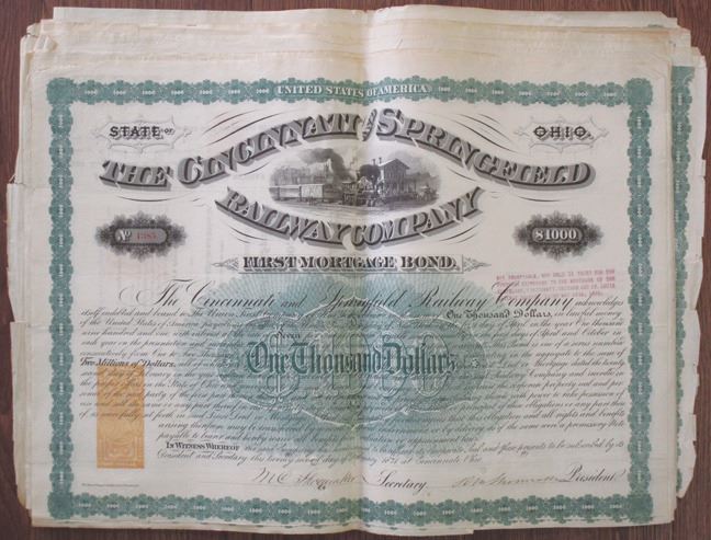 Ohio, 1871. 25 pieces, all the same: $1000 I/C 7% First Mortgage Bond, Black text with green border and undertint, Train pulling into busy station at top center. Imprinted revenue stamp at bottom left corner. Fine condition. (25)