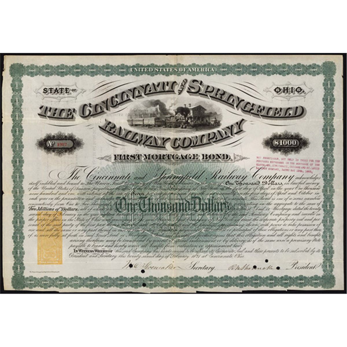 Cincinnati, Ohio, 1871, Lot of 10 Issued and POC bonds, $1000, 1st Mortgage 7% bonds, All with RN-W2 ($1 Washington) Imprinted Revenue on lower left. Some of the bonds have additional Austrian or German Revenue imprints, All in Fine to VF condition. Major Knapp Eng.