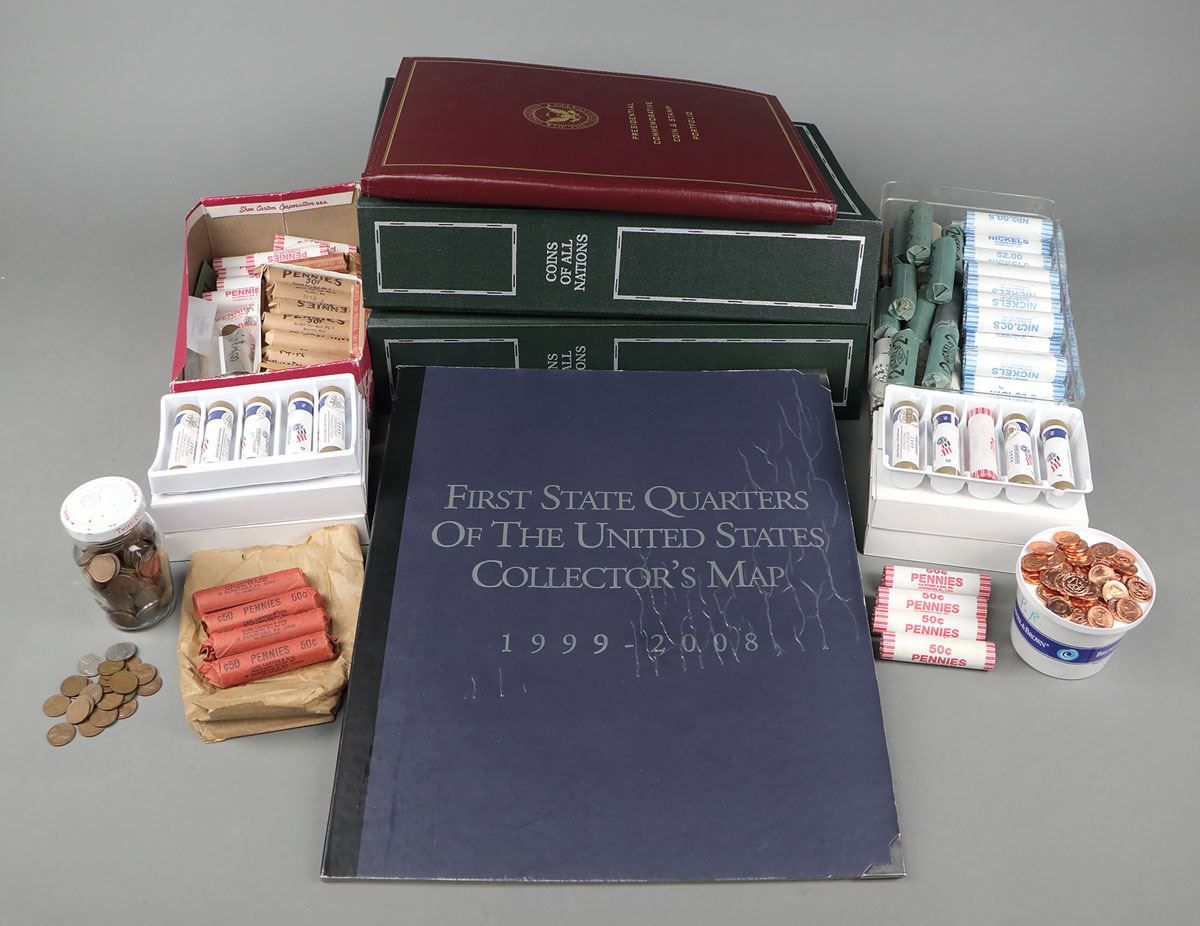 over 50 uncirculated penny rolls (ca. 2008-11) and 18 uncirculated nickel rolls (ca. 2003-05) and an uncirculated 2005 Canada Victory Anniversary Nickel roll; also included are 20 mixed circulated penny rolls with two rolls with dates between 1910 and 1930s; and over 43 circulated 5 rolls with mixed dates, all unsearched; the uncirculated penny roles include 2009-P and 2009-D Lincoln "Professional Life", and "President", "Formative Years" rolls; additional mixed groups of unsearched pennies and nickels are included; face value over $150 (78+ rolls of nickels and pennies). Shipping charges apply - weight 83 lbs. (photo on web site)