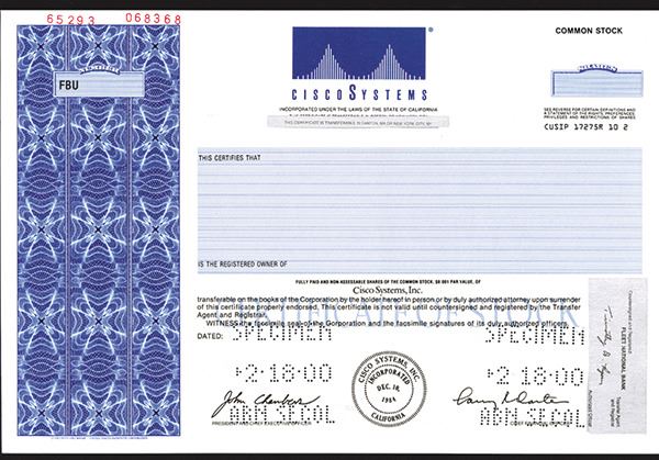 California, 2000, Pin punch Specimen Stock, Odd Shares, Black print on blue border and underprint, Cisco Systems logo top center, VF-XF condition, USBNC.