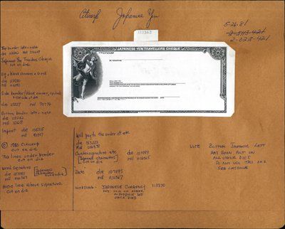 NY. ca.1980's. 5,000; 20,000 Yen 3 different die proofs of Traveler's Checks payable in Japanese Yen. Printed on india paper and mounted in manila file folders with extensive archival notations. Winged Mercury on left. 2 different denominations and one master proof design with no denominations that all the other notes were derived from. No undertint. The master proof with no denomination has itemized list of all of the dies and rollers used in the production of the note. Over 20 different dies and rolls used to produce this one Traveler's Check. Choice uncirculated condition. Rare Citigroup Traveler's checks. ABNC.