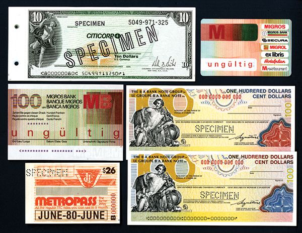 Citicorp Specimen Traveler’s Checks and Others. 1-4) Citicorp $10 specimen traveler’s checks, ND, green and orange. 5-6) B A Bank Note Group $100 traveler’s checks, one with a red geometric element, the other green.7-8) Migros Bank credit card blank and 100 SFR check, multicolor. 9) Metropass, $26, June 1980, AU. All but the last are Uncirculated. [9]