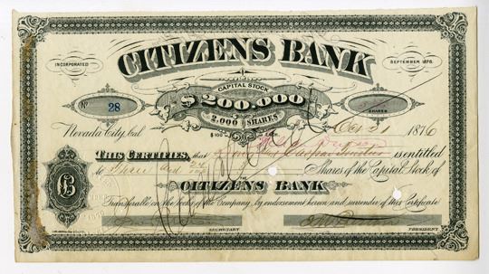 Citizens Bank, 1876. 3 24/100th Shares I/C Stock Certificate. Black print with title at top. Punched out and written cancelled. Fine-VF condition. Britton, Rey & Co.