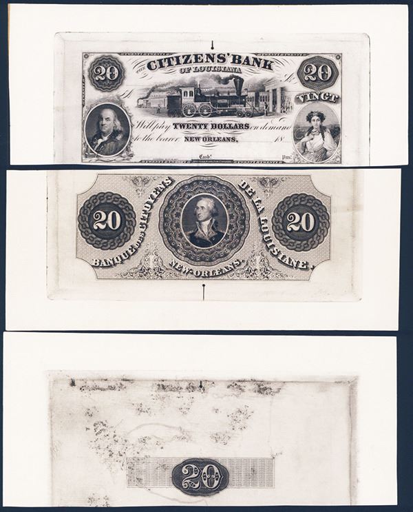 New Orleans, LA, 18xx (ca.1850-60's), Lot of 3 pieces, face, back and under tint impressions on soft bond type of paper in black, LA-15-G32a, Reprint proof only, Face with Franklin on LL, young female reaper on LR with Locomotive America with coal car in middle, back with French title of bank, portrait of George Washington, Similar to the 90 cents U.S. 1860's issue stamp and an impression of the 20 under tint, all in black instead of the issued green, CU condition, attractive note that can only be found this way. This is an earlier impression, not a modern Proprietary proof, ABN imprint but I am not certain who reprinted this note.