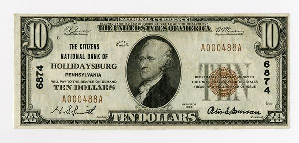 Hollidaysburg, PA. $10, Jones | Woods Signatures, S/N A000488A, there were 4 previous examples of this note known before this NTC note was discovered. VF to Choice VF.