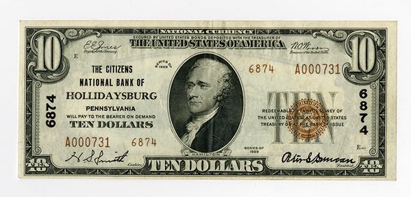 Hollidaysburg, PA. $10, Jones | Woods Signatures, S/N A000731, there were 6 previous examples of this note known before this NTC note was discovered. VF to Choice VF.