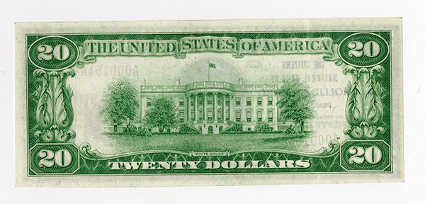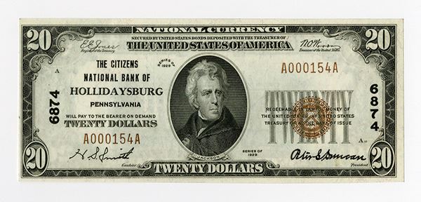 Hollidaysburg, PA. $20, Jones | Woods Signatures, S/N A000154A, AU condition due to a very light vertical fold, otherwise a very attractive note.