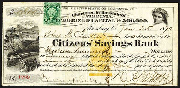 VA. Petersburg. Citizens' Savings Bank 1870. Certificate of Deposit. With printed revenue stamp, and additional real stamp. VF