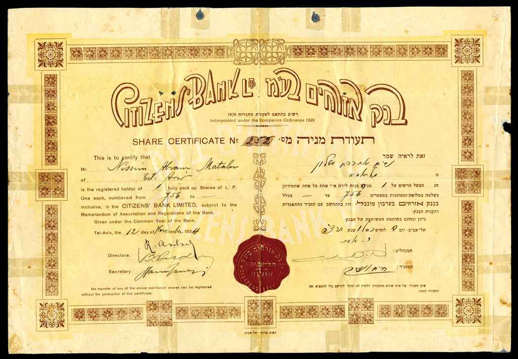 Palestine, Issued Tel Aviv, Palestine, November, 12, 1934, Numerous splits, Archival Repairs, (2) Punch Holes. VG/Fine.