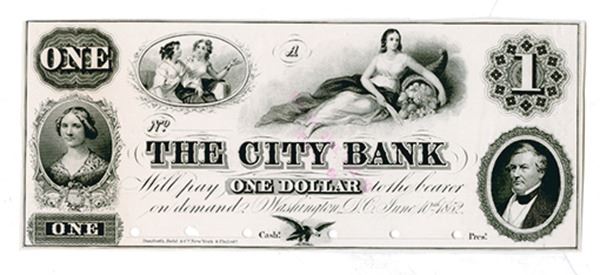 Washington, D.C., $1, Haxby #DC-185-G2 Unlisted Proof banknote, Black without undertint, Allegorical reclining "plenty" at top right, young women allegorical figures top middle left, Jenny Lind on lower left and Millard Fillmore lower right, POC's in signature block, a pink "Property American Bank Note Co" printed on blank back with very slight bleed to the front middle, the note is Choice AU to Uncirculated, DB&C.