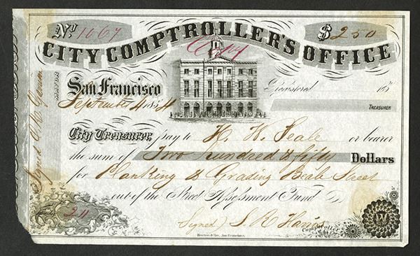 San Francisco, California. $250 warrant. Black print with a simple black border. Building at center of certificate. "Copy" written in red ink over vignette. Fine condition with staining and toning at bottom right and the lower left corner tip missing. Payable to H.H. Beale for Planking and Grading Beale Street.