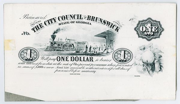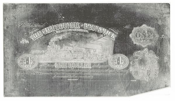 Brunswick, GA. 18xx. 201x115mm steel die for obsolete $1 interest-bearing note. Die proof taped to back (as used). One corner in the plate has been deliberately cut (not affecting the engraving). Virtually unobtainable in this form.