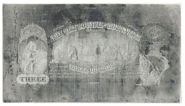 Brunswick, GA. 18xx. 206x115mm steel die for obsolete $3 interest-bearing note. Die proof taped to back (as used). Virtually unobtainable in this form.