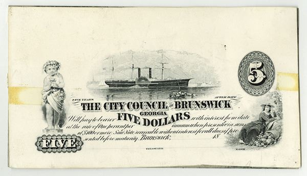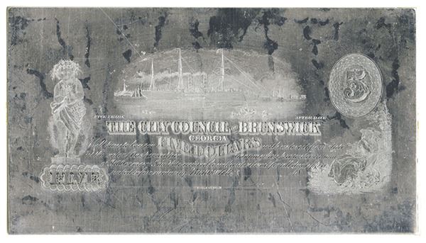 Brunswick, GA. 18xx. 205x115mm steel die for obsolete $5 interest-bearing note. Die proof taped to back (as used). Virtually unobtainable in this form.