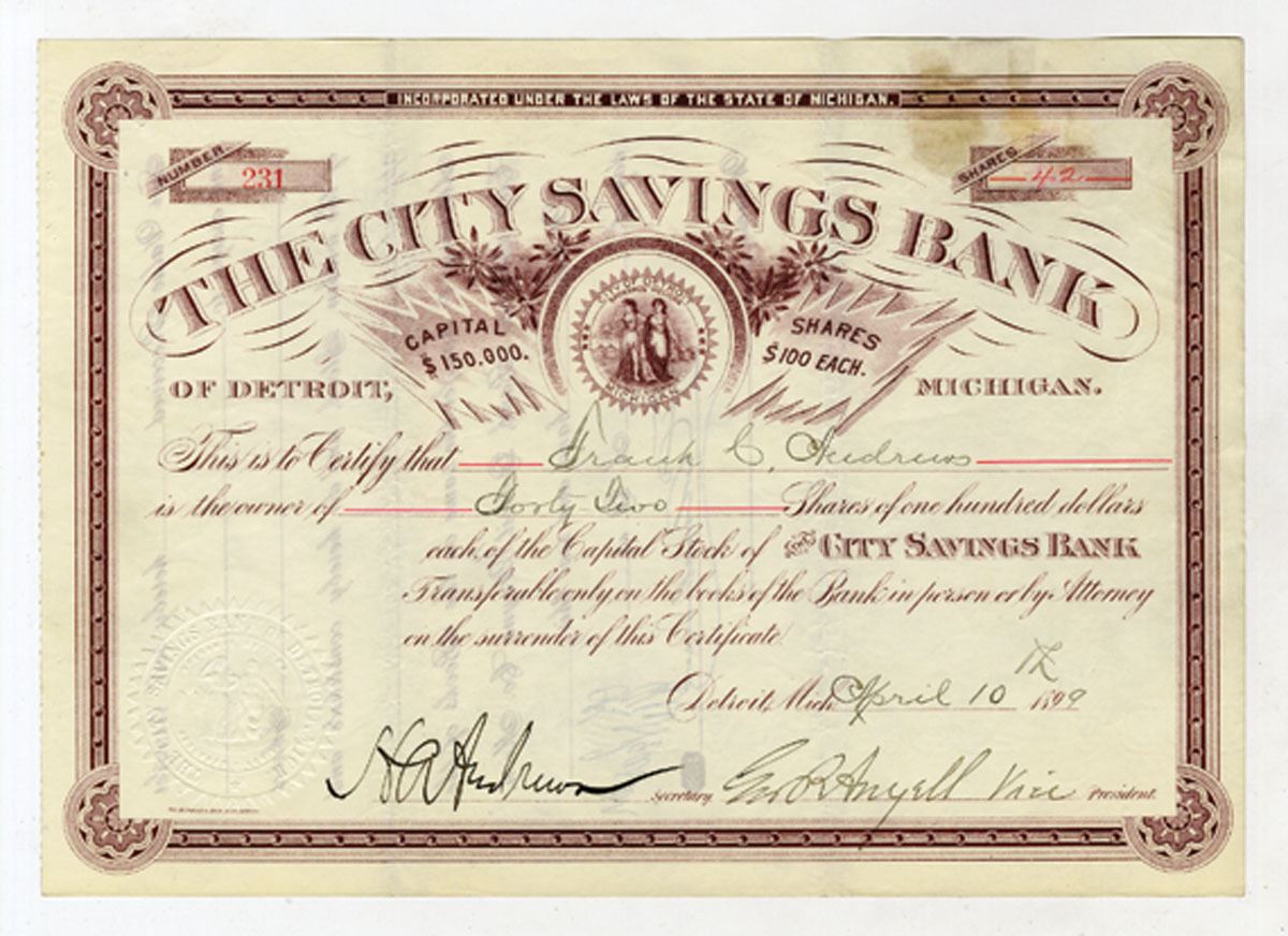 Detroit, Michigan, 1899. 42 Shares Capital Stock I/U Certificate, Maroon printing and border with seal of Detroit under title at center, S/N 231, Fine to VF condition with stain at top right corner.