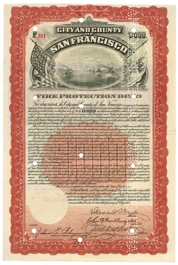 California. $1,000 Issued and Cancelled 5% Fire Protection Bond, Black print on red border and under tint, Vignette of approaching warships in San Francisco Harbor top center, Pin punched cancelled, VF condition.