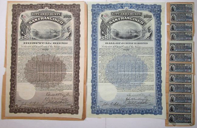 California, 1908. Lot of 2, I/C Bonds, Includes: $1000, 5% Hall of Justice Coupon Bond, Black with Blue border and underprint, S/N 122, Coupons are Included but are not attached and are glued onto brown paper; and, $1000, 5% Hospital Bond, Black with Brown border and underprint mounted on brown paper, S/N 38. Both pieces have the same vignette of the San Francisco Bay flanked by US flag and San Francisco flag, have POCs, are in Fine-VF condition, and were printed by WBNC. (2). Sold "AS IS" no returns accepted.
