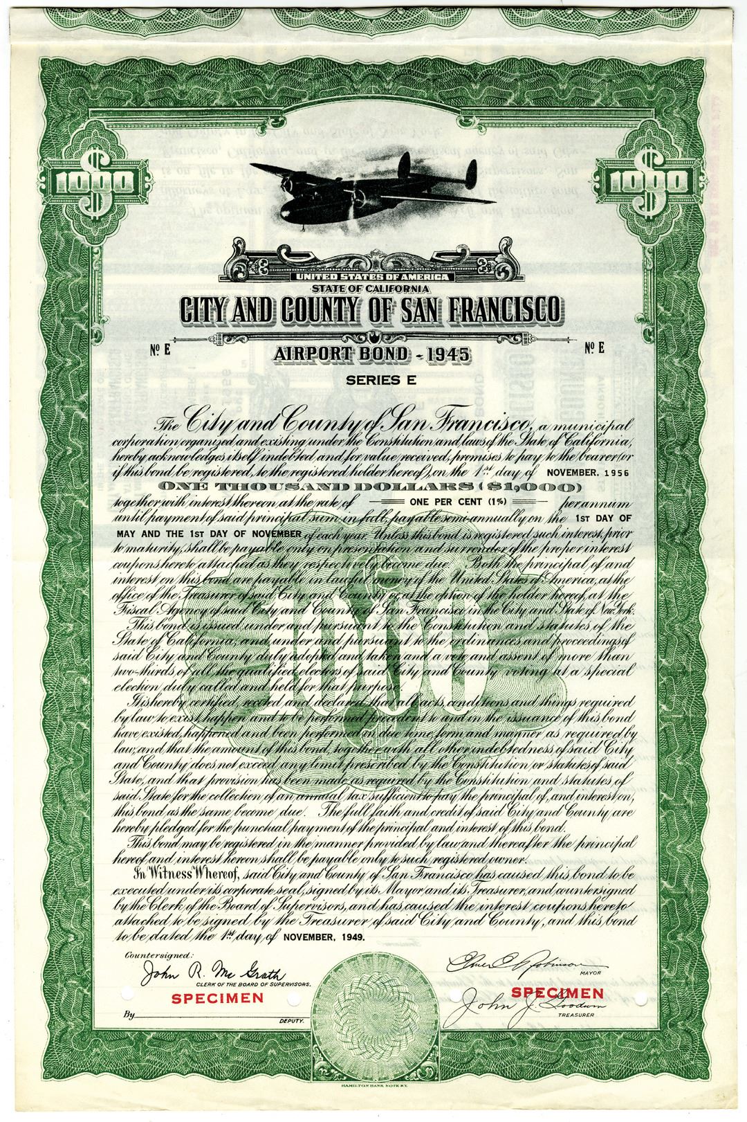California, 1949. $1000 Specimen 1% Airport Coupon Bond, Black text with green border, Plane illustrated at top center. Red specimen overprints, POCs, Fine-VF condition, HBN.