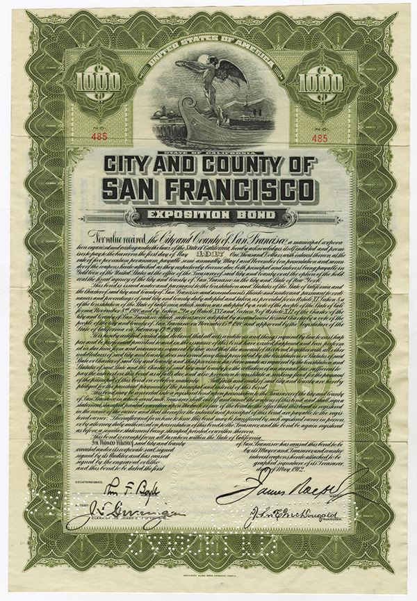 San Francisco, CA. May 1912, $1,000 I/C, 5% Exposition Bond, Black print on olive green border and under tint, No coupons attached. Vignette of angel standing on bow of wooden ship with steamship and exposition grounds behind. The Panama-Pacific International Exposition was a world's fair held in San Francisco, California between February 20 and December 4 in 1915. A specimen of this bond was sold in our first auction in January 2007 for over $900. SBNC. VF. Signed by Mayor James Rolf who also piloted the first San Francisco street car in 1912.