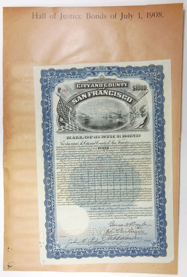 California. $1,000, Hall of Justice Coupon Bond, Black print on blue border and under tint, Image of Great White Fleet warships flanked by American Flag and California state flag, Mounted on page from Hall of Justice scrap book with bond on face and issued and cancelled coupons on back, Pin punched cancelled at bottom, VF-XF condition, WBNC.
