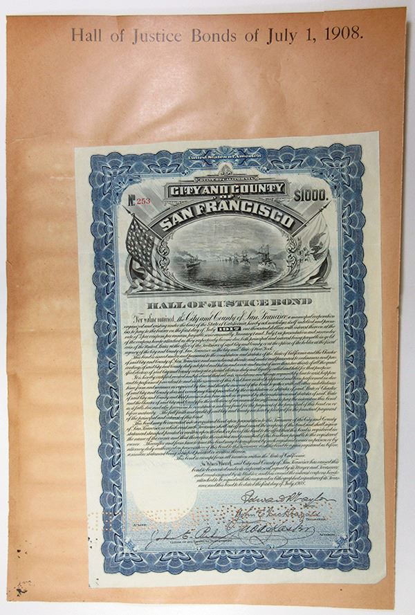 California. $1,000, Hall of Justice Coupon Bond, Black print on blue border and under tint, Image of Great White Fleet warships flanked by American Flag and California state flag, Mounted on page from Hall of Justice scrap book with bond on face and issued and cancelled coupons on back, Pin punched cancelled at bottom, VF-XF condition, WBNC.