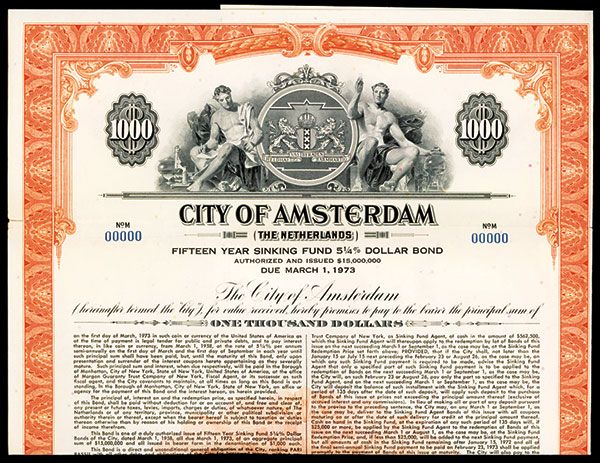Netherlands, 1958, $1000, 15 Year 5 1/4% Dollar Bond, Specimen, Orange with allegorical men flanking Amsterdam Arms, POC's, Coupons attached, XF condition. ABNC.