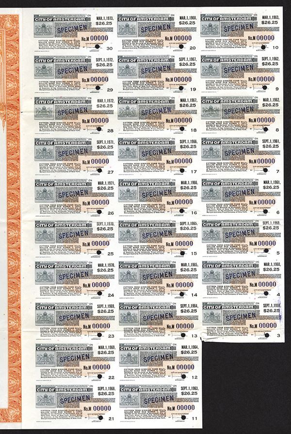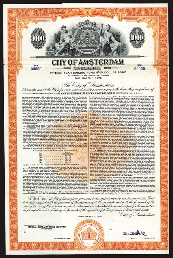 Netherlands, 1958, $1000, 15 Year 5 1/4% Dollar Bond, Specimen, Orange with allegorical men flanking Amsterdam Arms, POC's, Coupons attached, XF condition. ABNC.