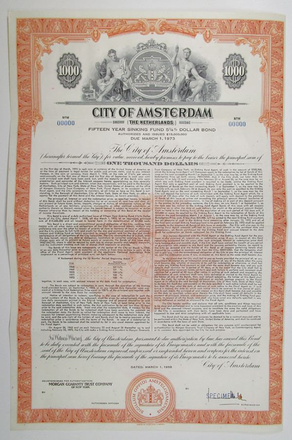 Netherlands, 1958. $1000 Specimen 5.25% Sinking Fund Dollar Coupon Bond, Black text with orange border and undertint, Amsterdam's coat of arms at top center flanked by allegorical men. Blue specimen overprints, 00000 serial numbers, and POCs. VF condition, ABNC.